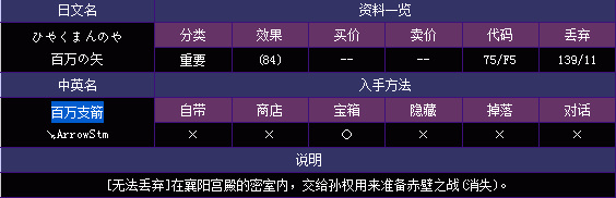 38、百万支箭,[无法丢弃]在襄阳宫殿的密室内,交给孙权用来准备赤壁之战(消失)。