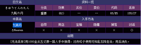 26、九转丹,[无法丢弃]用1000金从五丈原一路人手中换得,对赤松子使用可知乱石阵走法,用后消失。