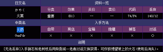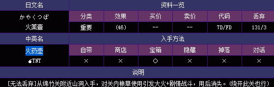 37、火药,[无法丢弃]入手硝石和老树枝后同柴桑城一老者对话交换获得,可炸毁博望坡上的大石(使用后消失)。