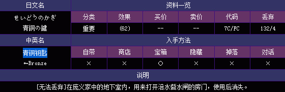 44、青铜钥匙,[无法丢弃]在庞义家中的地下室内,用来打开涪水砦水闸的房门,使用后消失。