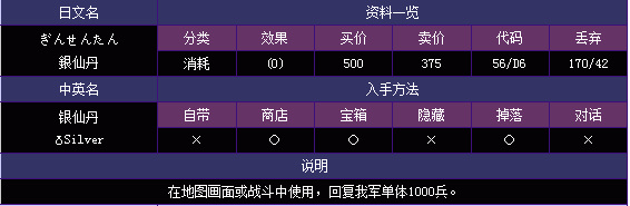 9、银仙丹,在地图画面或战斗中使用,回复我军单体1000兵。