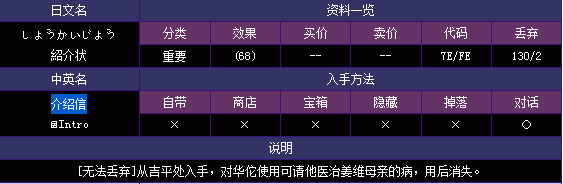 46、介绍信,[无法丢弃]从吉平处入手,对华佗使用可请他医治姜维母亲的病,用后消失。