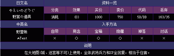 16、野营帐,在大地图(城、迷宫等不可)上使用,全体武将兵力和SP全回复,相当于住宿。