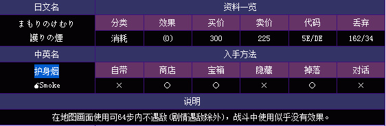 17、护身烟,在地图画面使用可64步内不遇敌(剧情遇敌除外),战斗中使用似乎没有效果。