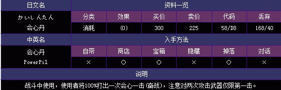 11、会心丹,战斗中使用,使用者将100%打出一次会心一击(奋战),注意对两次攻击武器仅限第一击。