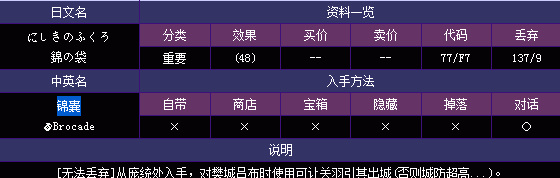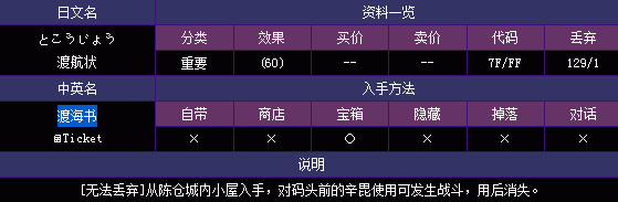 47、渡海书,[无法丢弃]从陈仓城内小屋入手,对码头前的辛毘使用可发生战斗,用后消失。