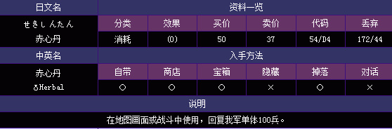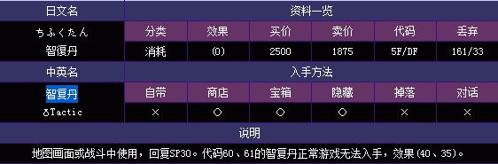 18、智复丹,地图画面或战斗中使用,回复SP30。代码60、61的智复丹正常游戏无法入手,效果(40、35)。