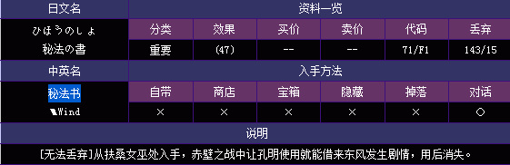 34、秘法书,[无法丢弃]从扶桑女巫处入手,赤壁之战中让孔明使用就能借来东风发生剧情,用后消失。