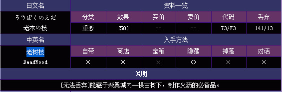 36、老树枝,[无法丢弃]隐藏于柴桑城内一棵古树下,制作火药的必备品。