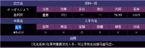 43、血书,[无法丢弃]在景帝墓最深处入手,可让李恢去说服马超马岱。