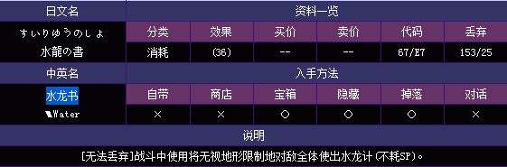 21、水龙书,[无法丢弃]战斗中使用将无视地形限制地对敌全体使出水龙计(不耗SP)。
