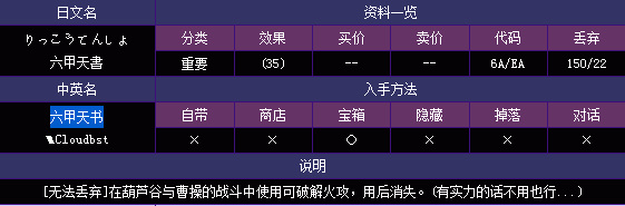 27、六甲天书,[无法丢弃]在葫芦谷与曹操的战斗中使用可破解火攻,用后消失。
