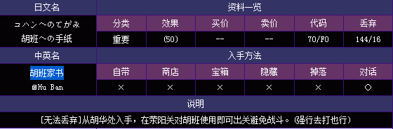 33、胡班家书,[无法丢弃]从胡华处入手,在荥阳关对胡班使用即可出关避免战斗。(强行去打也行)