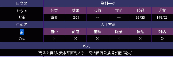 28、茶,[无法丢弃]从天水茶商处入手,交给黄石公换得水壶(消失)。