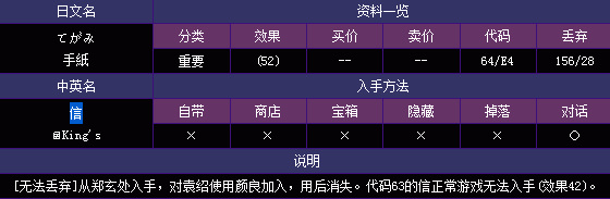 25、信,[无法丢弃]从郑玄处入手,对袁绍使用颜良加入,用后消失。代码63的信正常游戏无法入手(效果42)。