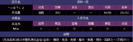 23、兵法书,[无法丢弃]战斗中随机使出金仙(全体)·静寂·免击·免策·暗杀·叛离·缚杀·陷阱之一(不耗SP)。