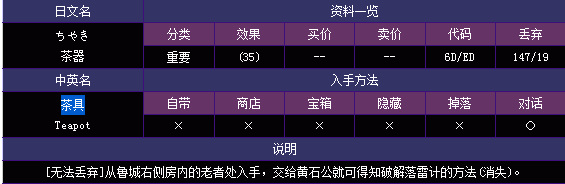 30、茶具,[无法丢弃]从鲁城右侧房内的老者处入手,交给黄石公就可得知破解落雷计的方法(消失)。