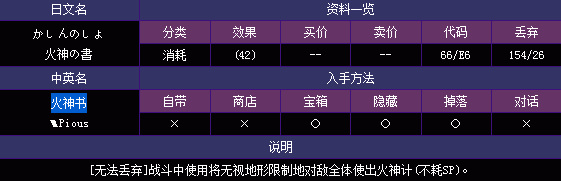 20、火神书,[无法丢弃]战斗中使用将无视地形限制地对敌全体使出火神计(不耗SP)。