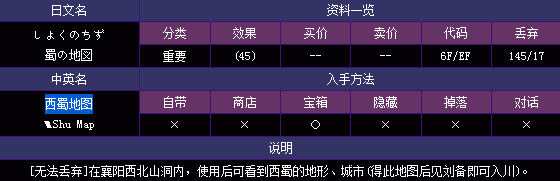 32、西蜀地图,[无法丢弃]在襄阳西北山洞内,使用后可看到西蜀的地形、城市(得此地图后见刘备即可入川)。