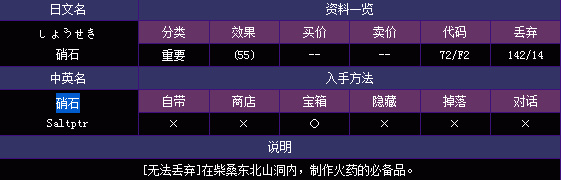 35、硝石,[无法丢弃]在柴桑东北山洞内,制作火药的必备品。