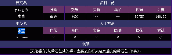 29、水壶,[无法丢弃]从黄石公处入手,去高老庄打来名水后交给黄石公(消失)。