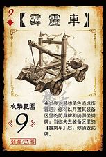 三国杀中一副牌堆的牌是固定的,锦囊,装备牌无非那几种。但是有部分武将的技能可以变出特殊锦囊和装备,均是牌堆中没有的牌,非常神奇!1 霹雳车在小说《三国演义》中,霹雳车最先由曹