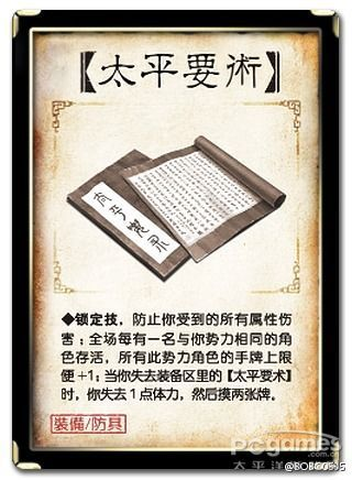 太平要术作为防具来说十分优秀,它附带了手牌上限、减伤、过牌等诸多要素在诸多防具卡当中也是极其多样化的。