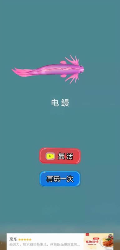 玩的过程中小白发现个小窍门只要一直溜着池塘边走就相对安全,减少一半突然撞到高级别生物风险,即使这样,小白我手残最多就玩到蓝色鲨鱼,游戏死亡后还有且仅有一次复活机会,会复活到你上一局最高级别生物,当然还需要观看广告。