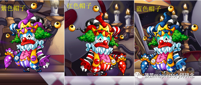 进阶小丑一共有3种形态,分别为(紫色帽子、红色帽子、蓝色帽子):