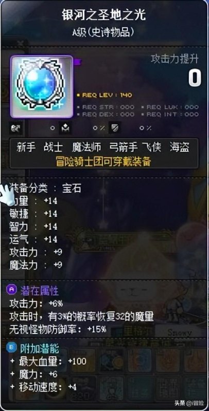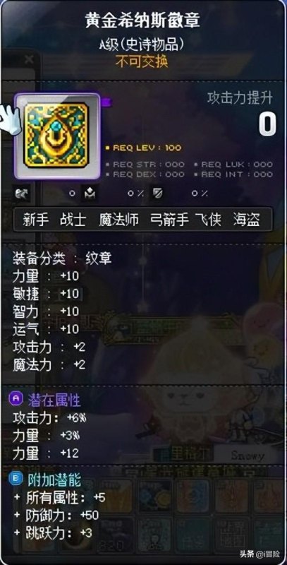 首先是跟武器同为三大件之一的纹章。这个部位比较特殊,他是系统赠送的,除了诺巴族的天使、狂龙等职业之外,大部分职业都是不可交易的,所以潜能属性只能自己调整。作为平民,我们只需要上一个A级潜能卷,洗出6%攻就可以先用了。