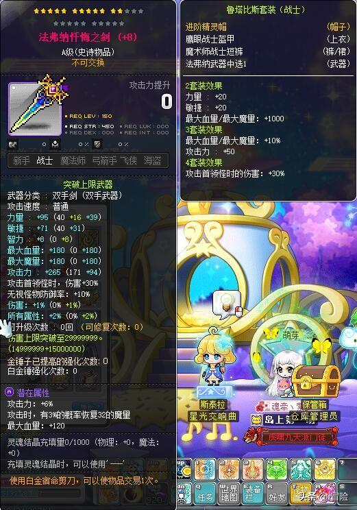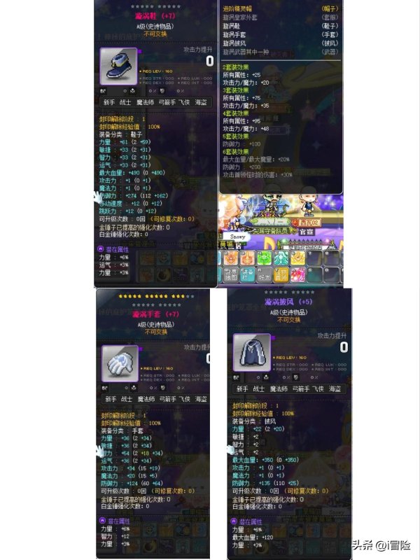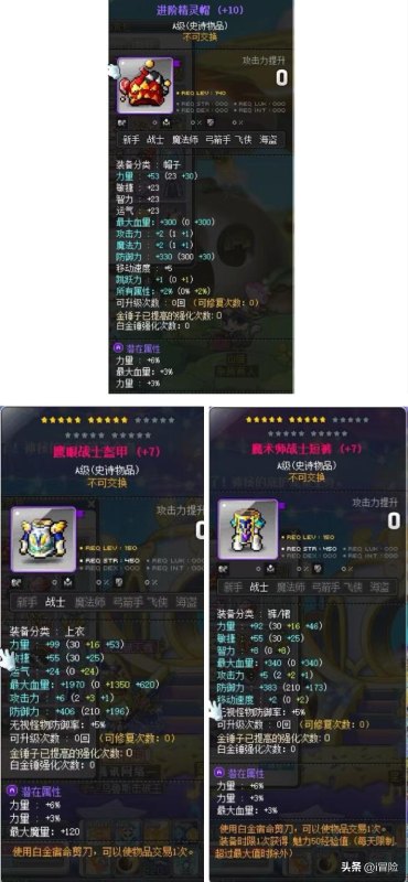 以上防具可以都做70%痕迹,A级潜能9%主属性即可。鲁塔上衣和裤子可以用老麦商店的150级12星卷上星,漩涡套先不上星也没关系,他们的套装属性太给力了。