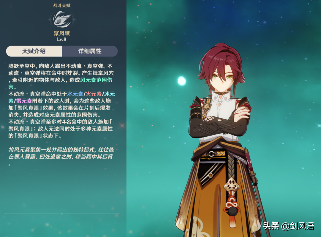 1.大招弱风,爆发命中处于火/水/雷/冰元素影响下的敌人时会产生【飓风真眼】的效果,该技能的整个过程并不会发生元素转化。一共2个伤害,不动流·真空弹伤害和聚风真眼伤害。