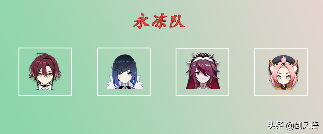 平藏驻场,夜兰后台输出并给平藏增伤,罗莎莉亚大招持续挂冰,迪奥娜套盾和回血,平藏不断触发扩散减抗和冻结,永冻输出环境相当好,夜兰可以换成行秋、心海。罗莎莉亚和迪奥娜,其中一个可以换成凯亚。
