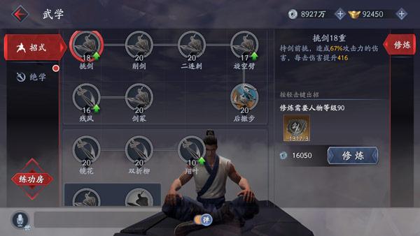 玩家在武学系统中可以消耗武学秘籍和银两来修炼已有武器对应的技能等级,并装配不同的绝学,从而发挥出武器最大的威力;