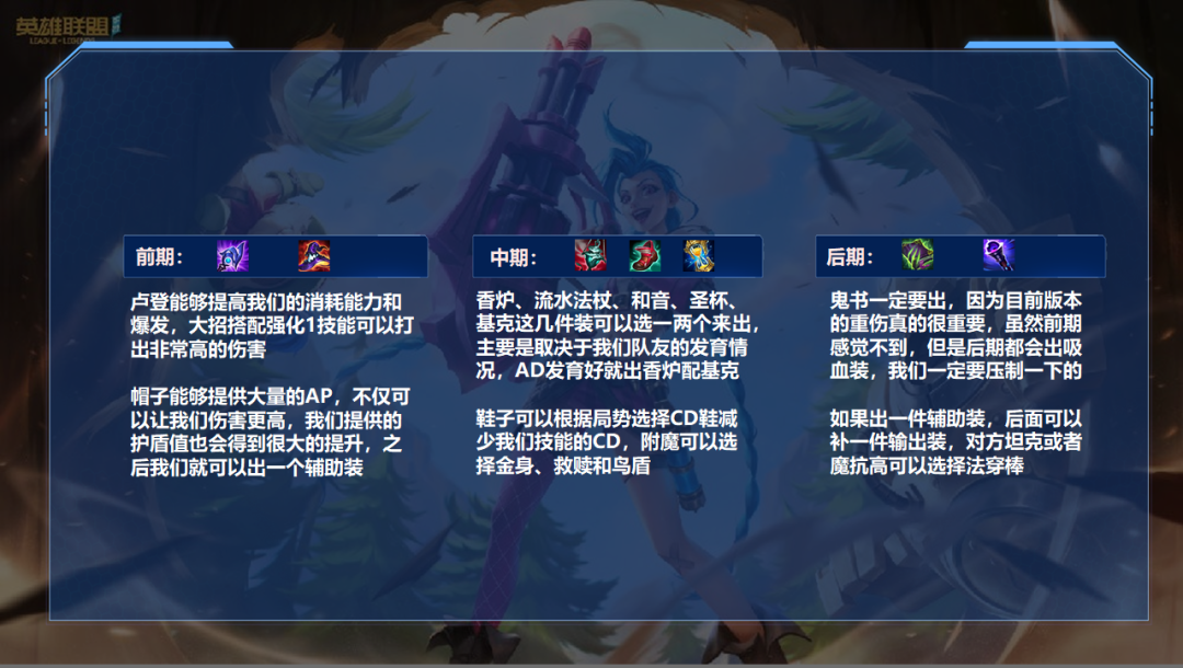 最后的一点需要大家注意的是,我们一定要固定出一个鬼书压制对方的吸血或者治疗效果。如果出两件辅助装那我们就已经神装了,如果出一件辅助装,最后我们可以根据局势选择性去补:法爆、法穿棒、冰杖、面具、女妖。