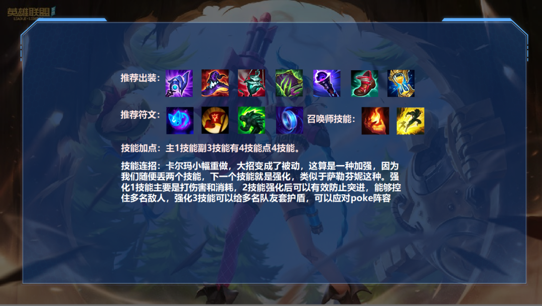 今天给大家分享一下小幅重做之后的卡尔玛玩法,我打完的感觉就是,操作难度是降低了很多,但是强度依然不错,我玩的是中路,试了一下半输出玩法,相比纯输出会舒服很多,接下来我就把重要的知识点分享给大家。