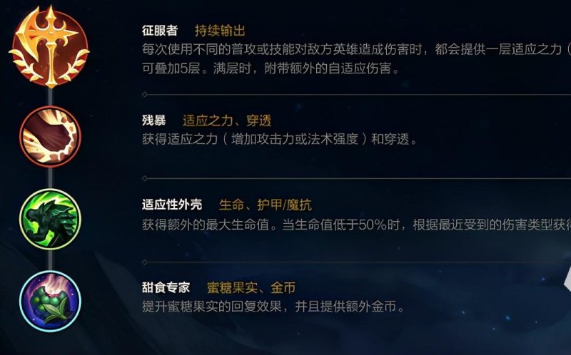 不管是选择暴击流还是一刀流,在符文上都是没有根本改变的,全部都选择主系征服者为主,剩下的小天赋点风暴聚集、适应性外壳、甜食专家,尤其是一刀流出装一定要点甜食专家,对暴击流来说可以换成猎人,因为当饮血剑出来之后就不需要果子了。