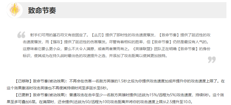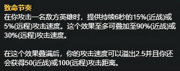 新版本的致命节奏普攻命中对手时提供攻速(近战15%,对于狼人的收益相对会比较高),而且最多可以叠加6层。最重要的是,致命节奏在提供攻速的同时,还可以将攻速上限从2.5拉升到10.0,这个上限的攻速进攻效率就会非常高。而且狼人的W技能是能自带攻速加成的,这样配合致命节奏,狼人的平砍输出、衔接进攻的效率就会非常高。所以在11.23版本的狼人配合致命节奏的胜率才提升如此之多,这也是当前版本狼人崛起的原因。