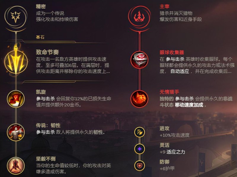 致命节奏在11.23版本改动以后对狼人相对会比较契合一些,狼人的输出效率直接拉满,进攻效率非常高。狼人属于打节奏的英雄,在第二层点凯旋,配合狼人高效的收割能力,这样狼人的续航能力能得到比较强的提升。第三层点韧性,可以提升狼人的对抗能力。底层符文点坚毅不倒,可以提升狼人的反杀能力。