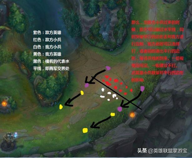 退出平行四边形:是指敌方两名英雄脱离平行四边形,等待兵线的到来。(一般是敌方两名英雄同时做的决策)