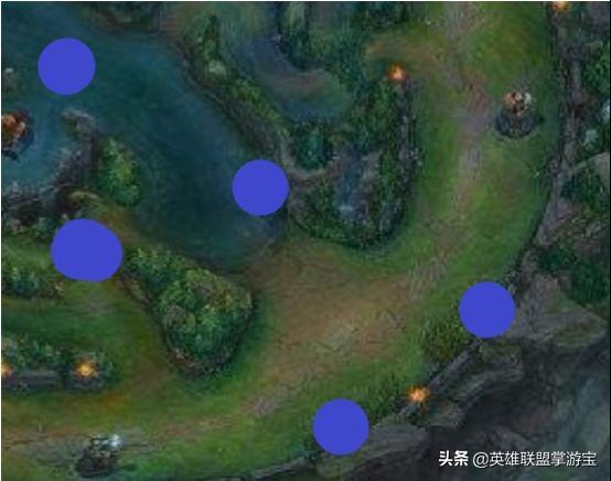 第一处是比较远的河道中间的草丛,这个草丛视野有两个作用,第一个是可以察觉到对面打野的入侵,因为正常来说打野很难从下面的入口入侵,因为很容易被下路的人或者是视野发现,但是河道视野相对没有那么广泛,而且河蟹的视野可以擦边走过去。