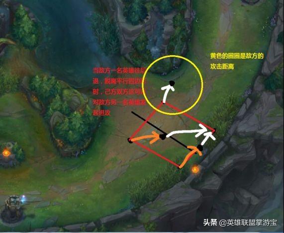 由图可以看出当敌方一名英雄往后脱离平行四边形时,我们可以抓住的机会。