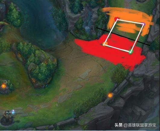 以上图片可以看出,在己方推线的情况下,水平线决定了平行四边形的位置,而敌方(橙色区域)的走位躲技能的空间因地形而被限制了,反而己方(红色区域)的空间则显得宽阔