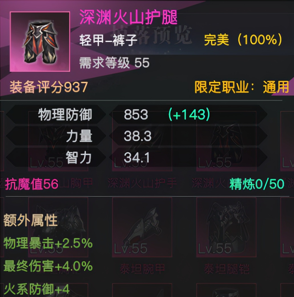 与各种50粉品轻甲裤子对比,火山腿提供了15点额外力量,同时提供了2.5%物理暴击及4%最终伤害。