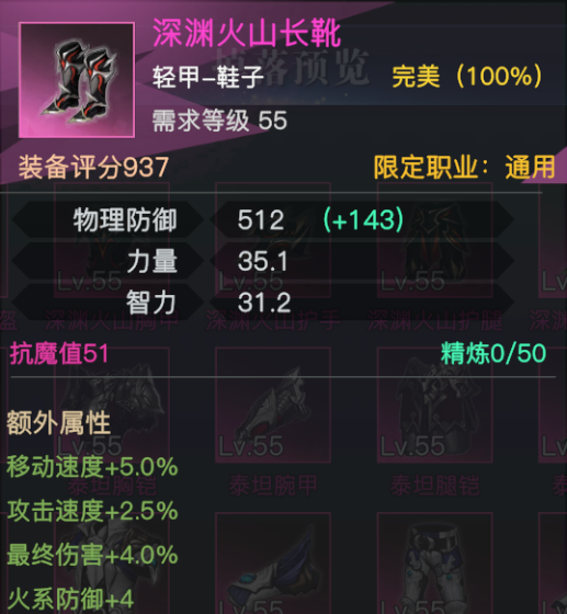 与各种50粉品轻甲鞋子对比,火山鞋提供了14点额外力量,同时提供了5%移速、2.5%攻速以及4%最终伤害。