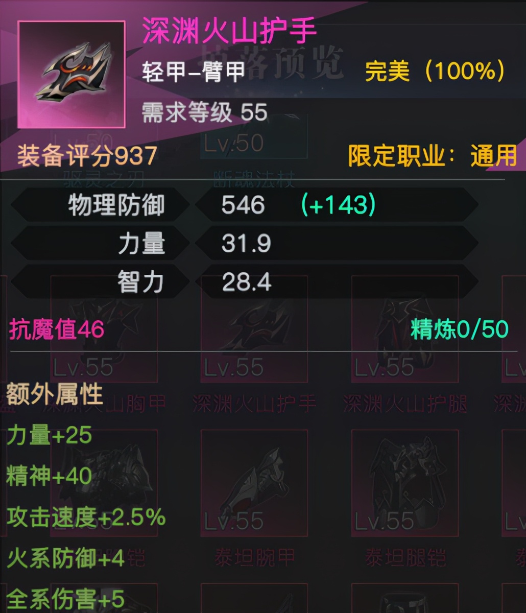 与各种50粉品轻甲臂甲对比,火山手提供了38点额外力量,同时提供了2.5%攻速及5点全系伤害。