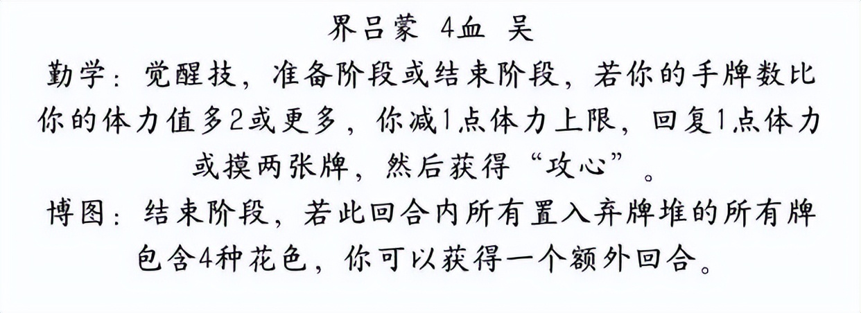 一方面,觉醒技勤学得到了加强,新版界吕蒙将勤学的觉醒时机提前了,哪怕是在自己回合结束时,都能得到觉醒。要知道吕蒙是有克己的,回合结束觉醒可以说是相当容易。而且,吕蒙觉醒竟然也有摸牌补偿了,这在收益论的角度来看突破是显而易见的。由于吕蒙觉醒后又能获得1牌差的技能攻心,简单算下来,界吕蒙轮均收益就已经达到了4血英姿水平。