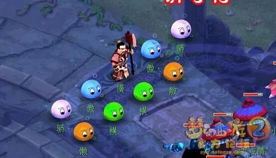 两端的橙色泡泡“懒”、“散”,是防御的,但物理平A他们一下会造成1W+的伤害,所以建议带溅射的DT第一回合平A橙色泡泡,这样溅射伤害都能达到5000+。