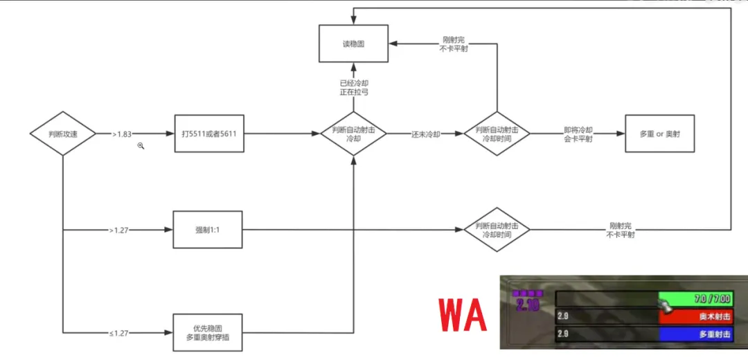 AHK+WA一键输出原理很简单,以兽王猎为例(配图来自B站:Bo_Rhap)用WA字符串将射击计时条着色并显示在屏幕的指定位置,AHK有屏幕读色功能,玩家只要疯狂按1,AHK就可以根据预先导入的算法帮助玩家选择并使用最佳的输出方案。