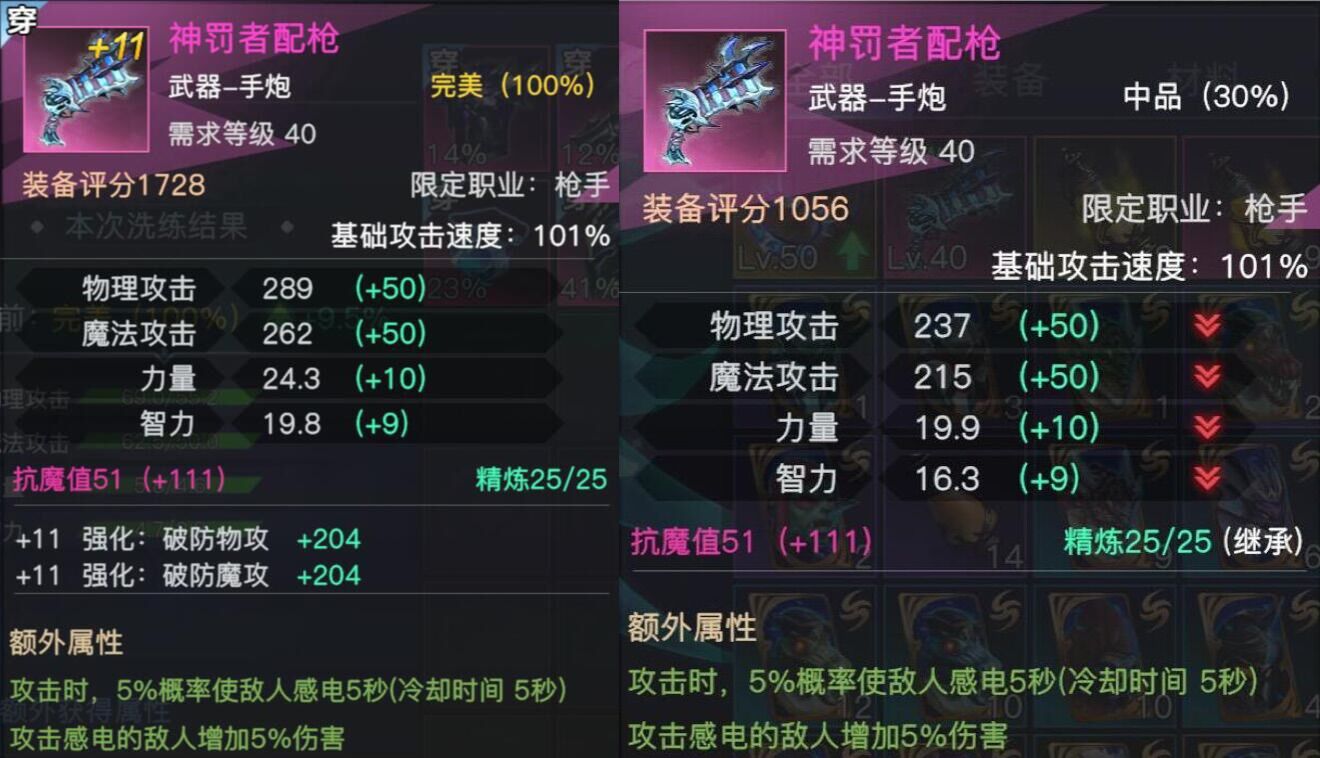 关于武器品级,由图我们可以看到,同一件40级粉品手炮的中品(30%)与完美(100%)可以有52点物攻的属性差异,而这部分差距不亚于于35级与40级武器的差距。